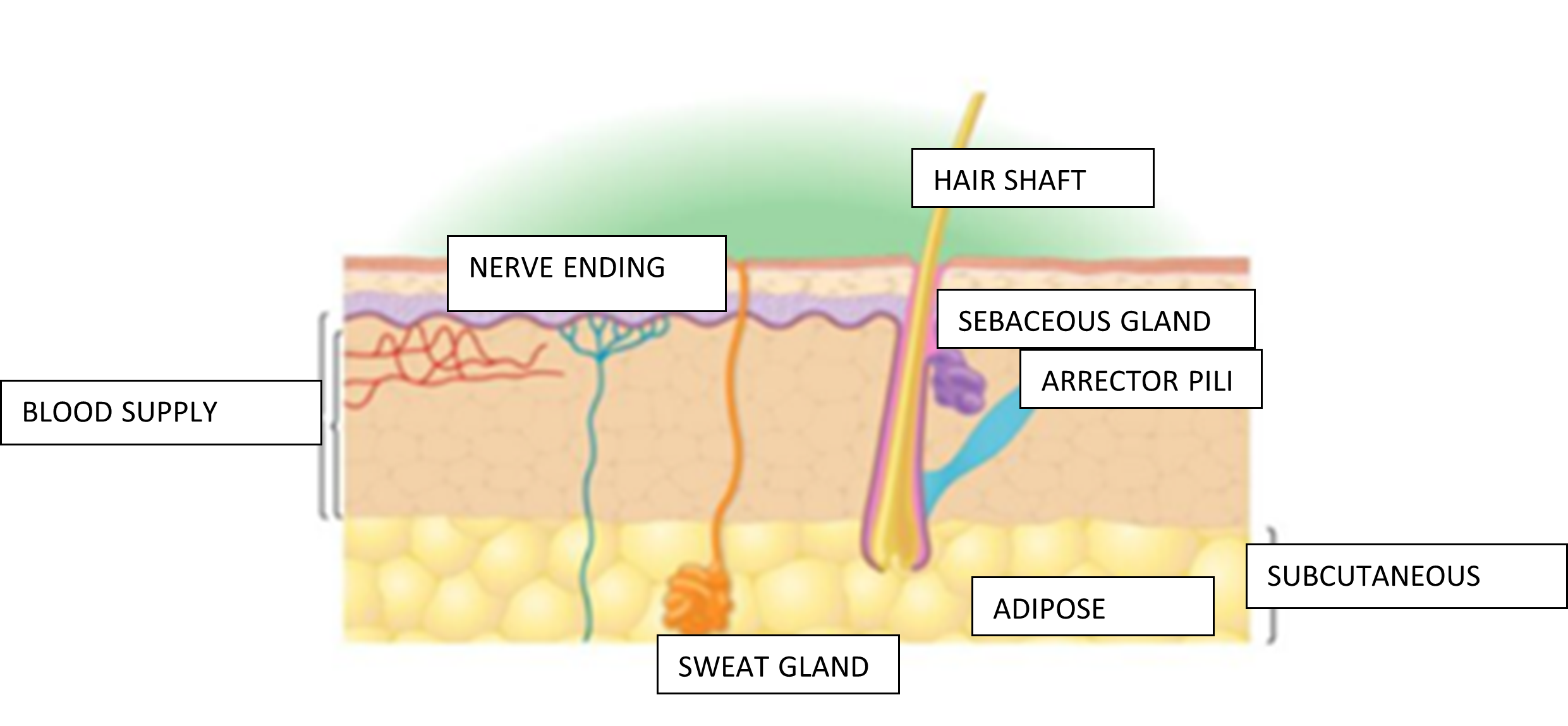 Hair in its follicle can be found on every part of the body (except palms and soles). This helps maintain body temperature through the arrector pili muscle, which traps air between the hair shaft and skin for insulation. The hair shaft itself offers additional protection to the skin surface by acting as a buffer, while the sebum secreted from the sebaceous gland via the follicle opening contributes to the skin’s protective acid mantle.